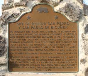 Mission San Pedro y San Pablo (Saint Peter and Saint Paul) de Bicuner was one of the two Missions established on the west side of the Colorado River near present day Yuma, Arizona. Founded on January 7, 1781, it was short lived being destroyed on July 17, 1781 by Quechans (Yumas) who were dissatisfied with treatment by the Spanish. The Missions didn't exist long enough to build much and little remains. The Mission was established to protect the Anza Trail where it forded the Colorado River. The destruction of the Mission closed this crossing and seriously crippled future communications between upper California and Mexico. The location is open to debate. Several accounts state that the site of Mission San Pedro y San Pablo is located 8 leagues down river from Purísima Concepción near Fort Defiance about half a mile above the Mexican Border. Several maps show this. There are also accounts stating that the site of Mission San Pedro y San Pablo is located 8 leagues up river from Purísima Concepción. There are maps that show this northern location. The road side marker is at the up river location. In correspondence with Phil Porretta, he presents good reason to believe that the northern location (upriver and where the marker is) is correct. Marker location: On County Rd S24, 0.2 mi W of intersection of Levee and Mehring Rds, 4.4 mi NE of Bard S24, near Coles Corner, about a mile west of the Colorado River, and a few miles south of Laguna Dam. NO. 921 Site of Mission San Pedro y San Pablo de Bicuner. |