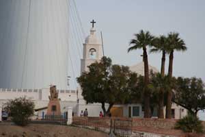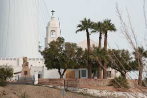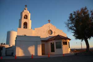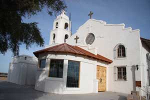 The first mission at Ft. Yuma was named Puerto de la Purísima Concepción, established in 1780, built by Father Francisco Garcés. The mission/pueblo site was inadequately supported. Colonists ignored Indian rights, usurped the best lands, and destroyed Indian crops. Completely frustrated and disappointed, the Quechans (Yumas) and their allies destroyed Concepción on July 17-19, 1781. On July 17, 1781, the Spanish Padres, settlers, and soldiers at that place and at San Pedro y San Pablo de Bicuner, 8 leagues up the Colorado river, were all massacred. Fort Yuma (1849-1885) became a U.S. military outpost in the 19th century and was revived as an active mission again in 1919. The current church, St. Thomas Indian Mission, was dedicated in 1923. The Mission was located on the California side of the Colorado River near where the Gila River joins the Colorado on Indian Hill. Times Open: The mission is closed during the week, but staff will accept visitors who make arrangements beforehand by calling (760) 572-0283. The mission is San Diego's eastern-most parish. Mass times are Sat. 4:30 and Sun. 9:30 a.m. June-Sept., otherwise 10:30 a.m. Reconciliation is Saturday 3:30-4:30 p.m. Although the Mission is in California and on Pacific Time, because of its proximity to Yuma, it generally operates on Mountain Standard Time. California Historical Landmark No. 350. In the forcourt of the church is a statute of Padre Garcés. Location: St. Thomas Indian Mission, Indian Hill on Picacho Rd, Fort Yuma, 1 mi S of Winterhaven Location: St. Thomas Indian Mission is at Fort Yuma, California at the extreme southeast corner of California. Fort Yuma, California, Colorado River's west bank, opposite the present city of Yuma, Arizona. Take Interstate 8 almost to the Arizona border. After the check station, turn off on Winterhaven. Turn left on 4th Ave. When you come to a sign that reads "To Bard," turn right. At the fork in the road, go right. Turn left at the dead end and you will come to the church. It's actually easier than these directions sound. From the Arizona side, cross the Ocean to Ocean bridge and turn right. And there it is. It's on top of the only hill in the area and easily visible from a distance. |