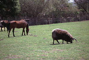 | Large area with animals typical of those that would have been kept at the Mission. | |