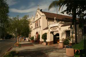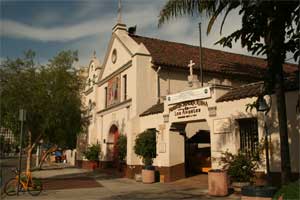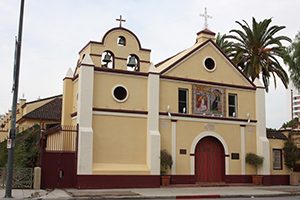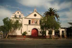 Nuestra Senora la Reina de Los Angeles, began as an asistencia to Mission San Gabriel. It is now familiarly called the Old Plaza Church in Los Angeles and is part of the El Pueblo de Los Angeles Historic Monument near Olvera Street. Mission San Gabriel served the spiritual needs of the Indians, soldiers, and rancheros for several decades until Asistencia Nuestra Señora was formed at nearby Los Angeles. Two priests were assigned to Mission San Gabriel and they divided their time between the Mission and the Asistencia. Our Lady Queen of the Angels Chapel (the Old Plaza Church, or La Placita, founded in 1781) was given parochial status in 1826 and assumed the ecclesiastical welfare of the city and its environs. It is Landmark 144. |