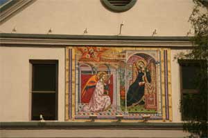 | Detail of mosaic on the front facadeof the Plaza Catholic Church. | |