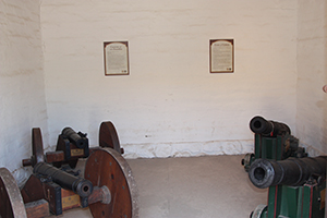 | Cannon Display. Two cannons (back in left image, left in right image) are reproductions of the Presidio cannons, used for defense. The original cannons had a 1.5 inch bore and a 36 inch barrel of bronze firing a 4 pound ball and were of British manufacture. Two cannons (forward in left image, right in right image) are Cannon 'C' and Cannon 'D' found in the sand along the beach of Goleta Beach Park after a storm in 1982. The five cannons found may be from the Spanish ship Dorotea which grounded in 1829 and was refloated a year later. These two guns have a 3.3 inch bore and a length of 54.25 inches, weighing 625 pounds and fired a 4 pound ball. The guns were restored. | |
