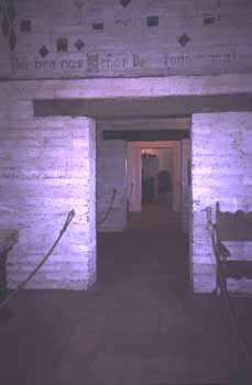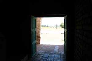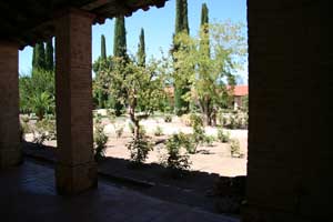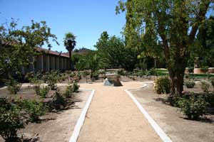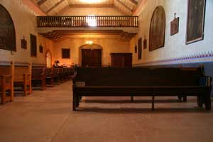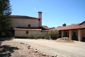 to the mission requires a drive through rolling hills and farm land. While well worth the effort to visit this mission, be aware that Mission San Antonio is on a military base and proper identification of all visitors is required along with automobile registration and proof of insurance. Don't be fooled by the Spanish Revival former Hearst Hacienda, now base headquarters building on the hill to your right. Continue a little further and the mission reveals itself ahead of you as the road curves to the right. I am sure that Mission San Antonio's isolated location on a military base has contributed to the magic of this mission experience. We visited this mission December 27, 2003 and again on September 3, 2007. Mission San Antonio de Padua now resides within an 85 acre holding within Fort Hunter Liggett. | ||