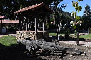![]() Sculpture of a Native girl and California grizzly bear in a plaza in front of the church.. |