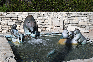 | Sculpture of a Native girl and California grizzly bear in a plaza in front of the church. | |