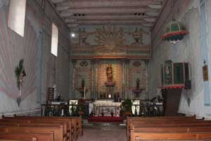 In the summer of 1795, Father Sitjar from Mission San Antonio de Padua conducted several searches of the area between San Luis Obispo and San Antonio, seeking a sutable location for a new Mission. Two years later, Fermin Francisco de Lasuen took possession of the land for Viceroy Branciforte and founded Mission San Miguel Arcángel on July 25, 1797. The Mission was named for Saint Michael Arcangel, Captain of the Armies of God, "Most Glorious Prince of the Celestial Militia," or "Most Glorious Prince of the Celestial Militia, Archangel Saint Michael," there are seveal similar translations by different people. This was his third of four mission founding that summer, the other three being San Jose (June 11), San Juan Bautista (June 24) and San Fernando (September 8). The site was chosen as a half way station between San Luis Obispo and San Antonio, and also to be next to a large Salinan Village known as Cholam or Cholami or Sagshpileel (references vary). With the establishment of Mission San Miguel, the northern half of the mission chain was complete from Mission San Luis Obispo to Mission San Francisco de Asis. The mission is near the juncture of the Salinas and Nacimiento Rivers with trees for building nearby. The climate was hot and reports differ, some say good soil, some say bad. Regardless, the Mission was quite successful and still lies in a valley surrounded by agriculture. The first winery is believed to have started here and today there is a growing wine industry in the valley around the mission. Father Buenaventura Sitjar was the first administrator at Mission San Miguel. He had ministered to the Salinan people for twenty-five years at Mission San Antonio and was fluent in the Salinan language and had a good relationship with the Salinan people. Again reports vary saying 15 or 25 Indian children were baptized at the founding of the mission. Once the Fathers had blessed the site, they and the soldiers started constructing a small building in which to hold Mass. Temporary buildings of wood poles and brush would quickly be replaced by buildings of adobe or stone and lumber. By the end of the first year, a 71-foot-long brush fence, an adobe chapel and a Convento had been built. Work shops soon followed and by 1800 there were five more adobe structures. A Monjerio was built for unmarried girls and women, which was locked at night. Over one thousand neophytes were living and working at the Mission by 1806. The Salinan tended the fields and vineyards and hearded livestock at the Mission. Some learned trades such as carpentry, masonry, blacksmithing, weaving, soap and candle making, leather working, and cooking. They learned to fire bricks. By 1805, forty-seven houses had been built for the neophytes. After a few years the Mission was self-sufficient and raised enough food, cattle, and other animals to feed everyone. The neophytes learned leatherworking, metalworking, wine making, and pressing olives for olive oil. The work of the mission became a routine. Bells were rung to signal dinner (lunch) at noon and the end of the work day. The neophytes would pursue traditional tasks until the women went to bed at 8:00 pm and the men at 9:00 pm. When married men were away for extended periods, the married women under a certain age were housed in the same dormitory as the unmarried girls and locked for the night. In 1806, the thatched roofed church and most of the buildings were lost to fire. Stores of wool, cloth, leather goods, and over 6,000 bushels of grain were also destroyed. The fathers and neophytes labored for ten years making adobe blocks and tiles in preparation to build a new church, as many as 36,000 tiles may have been made between 1808 and 1809. Padre Marcelino Cipres (1769-1810) died at the Mission on January 31, 1810 and was buried in the sanctuary of the Church. At the time of his death, he was assisted by Fathers Juan Cabot, Pedro Cabot and Juan Martin. Padre Juan Cabot served San Miguel from October 1, 1807 until March 12, 1819 as assistant to Padre Juan Martin, and from November 7,1824 until November 25, 1834 to run the Mission after the death of Father Juan Martin in 1824. Padre Juan Martin (1770 -1824) served at the Mission from December 3, 1797 until August 17, 1824. He was responsible for building most of the Mission and he would supervise the construction of the new church (begun in 1816) and is credited with much of the success of the mission. The stone foundation of the church was completed in 1816 and by 1818 the new church was ready for roofing. The heavy timber for the rafters and ceiling beams were brought in from the mountains forty miles away. The roof was covered with the tiles that had been prepared in the preceding years. A colonnade extends south from the church containing twelve arches of different sizes and shapes and it is considered unique among the California missions. The main structure was completed in 1820. It was 144 feet long, 27 feet wide, and 40 feet tall with six foot think walls at the base and was large enough to hold 1,000 worshipers. Padre Martin died on August 29, 1824. The church still had no bell tower, this would be added later. The new church also lacked decoration but this changed with the arrival of Esteban Munras from San Carlos, near Monterey. Estevan Carlos Munras is credited for instructing some of the neophytes in the art of fresco painting. Although now showing signs of age and damage, these beautiful and intricate wall decorations have survived since 1821. There was fear that the earthquake of 2003 would damage the art, but the retrofitted church shows few signs of damage to these wonderful examples of Mission era art. This art is rare in the Mission system today and Mission San Miguel is famous for these surviving examples of Neoclassical decor. Mission San Miguel did not have a traditional bell tower although one exists now on the north side. Bells at the time were typically hung from a wooden beam in one of the archways. Th