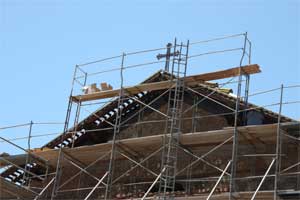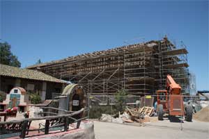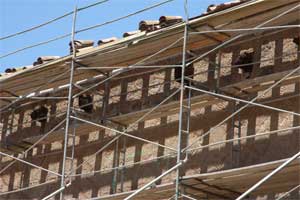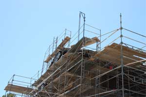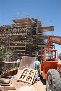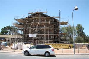 | The front courtyard with the scaffold surrounded church beyond. | |