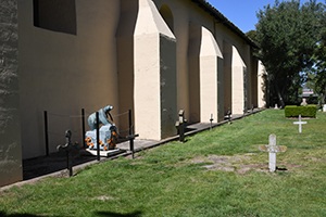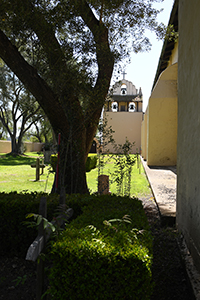 Church at right, campanile in the distance, cemetery to the left.
