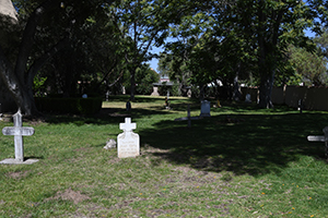 Cemetery with campanile beyond.