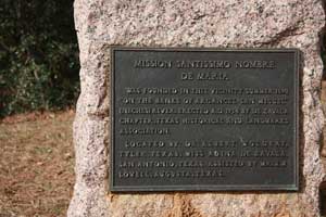 | Mission Santísimo Nombre de María was the second mission established by the Spanish in East Texas. It was founded on the bank of Arcangel San Miguel River, now Neches River, in the summer of 1690. The Mission was built for the native Neches population, the mission opened in September 1690 6 miles (10 km) northeast of Mission San Francisco de los Tejas. The mission consisted of a straw chapel and a house for the priest. It was destroyed by a flood in 1692. Mission Santissimo Nombre de Maria Today only a roadside marker notes the vacinity. The marker was placed in 1934. |